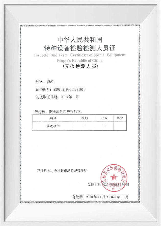 Potvrda o inspektoru i ispitivaču o Posebnoj opremi Narodna Republika Kina